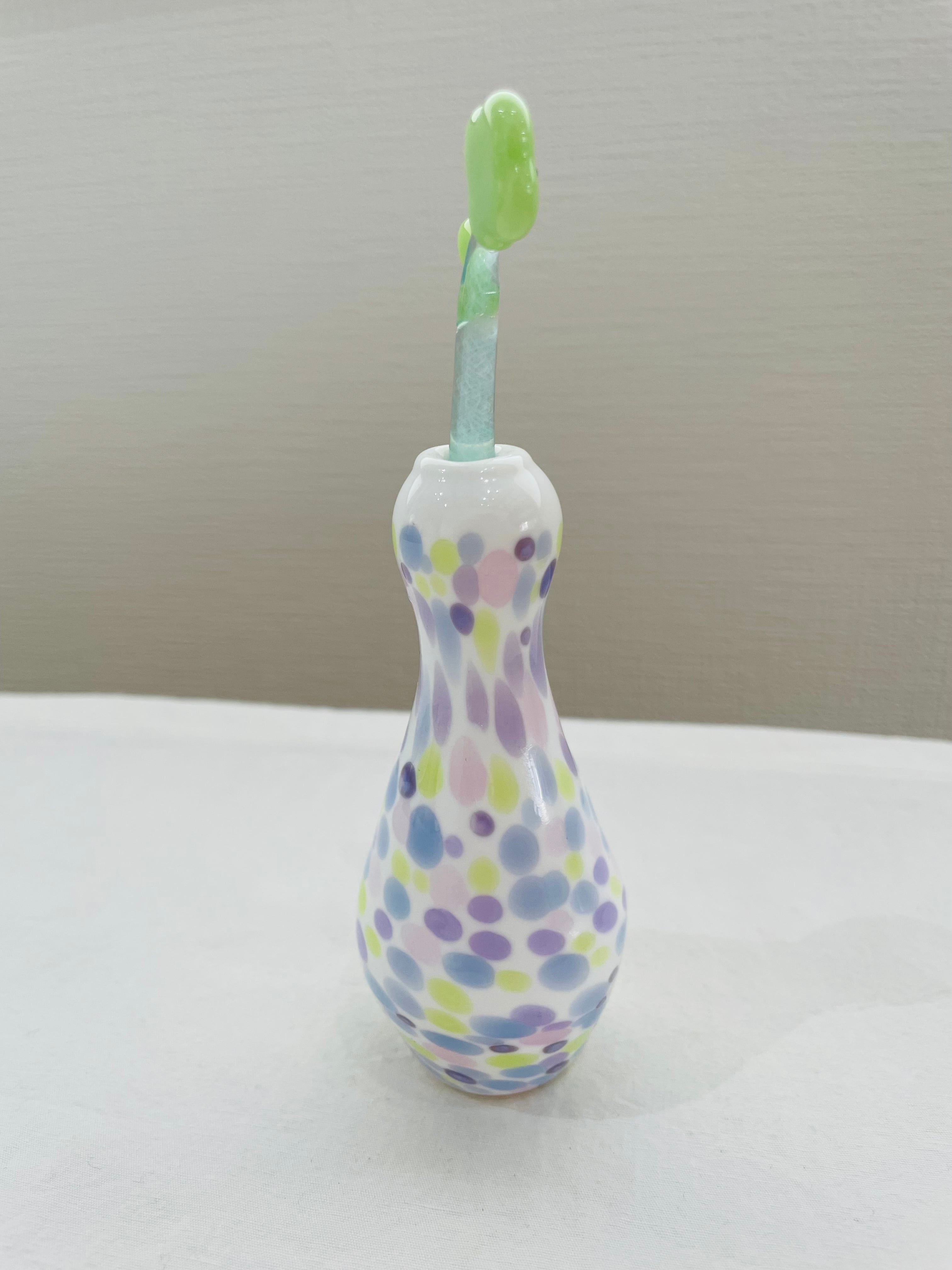 スラっとしたシルエットのフラワーベースは白地にパープルやピンク、ブルーの優しい色味のまだら模様がポイント。