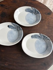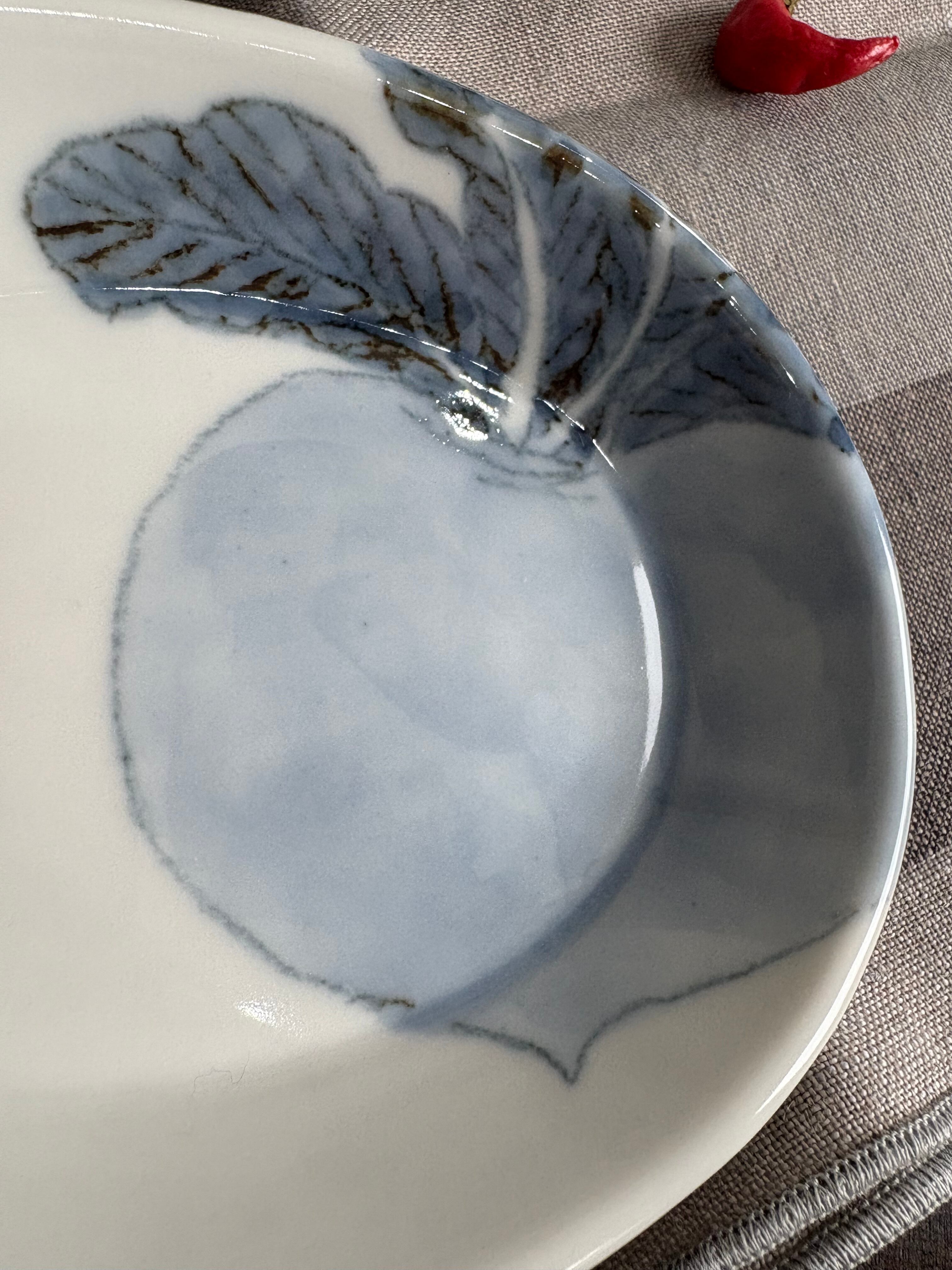 小長谷さん特有の温かみのある染付けがとても魅力です。お皿の裏側にも表面の葉が飛び出ているように