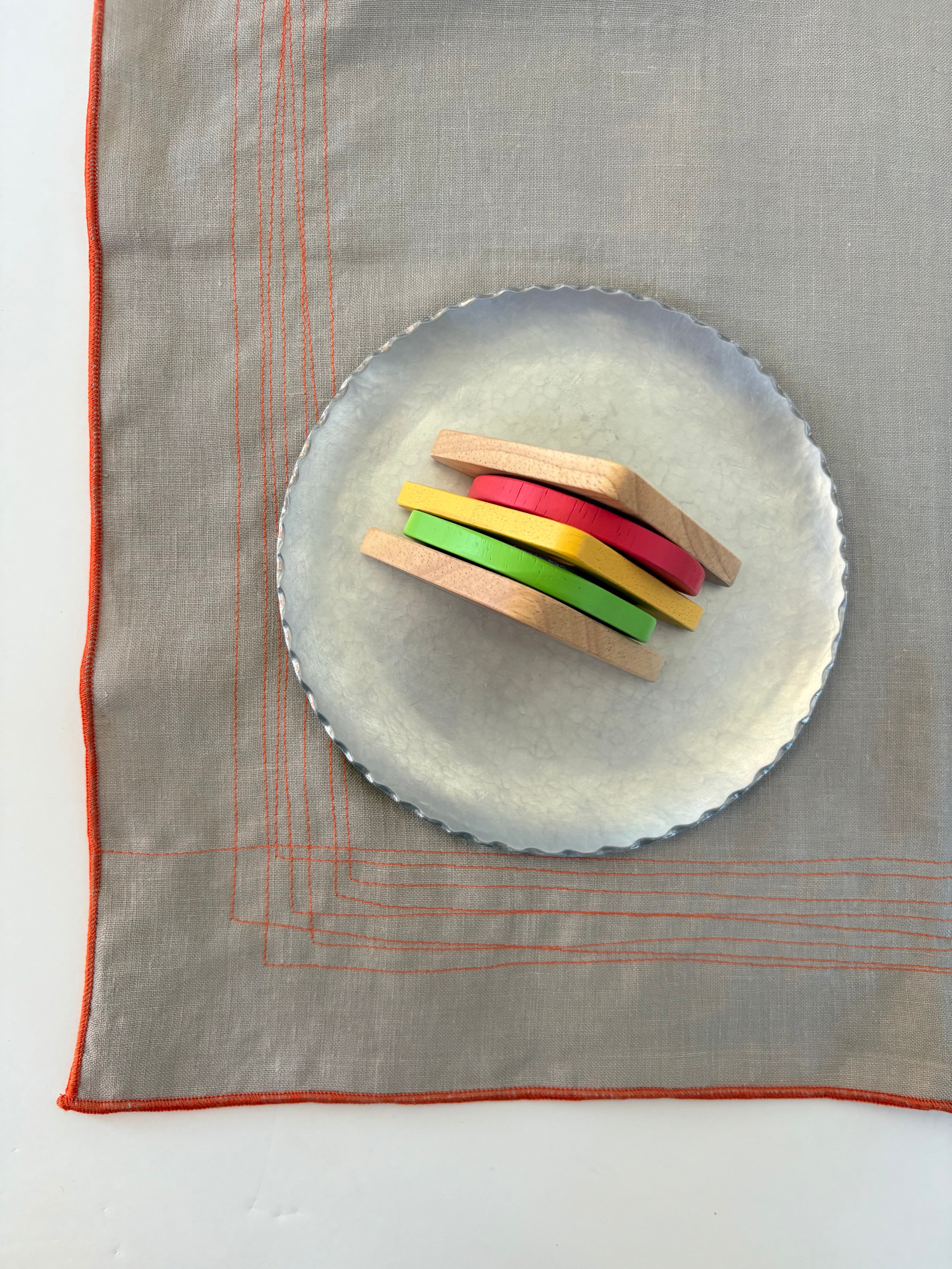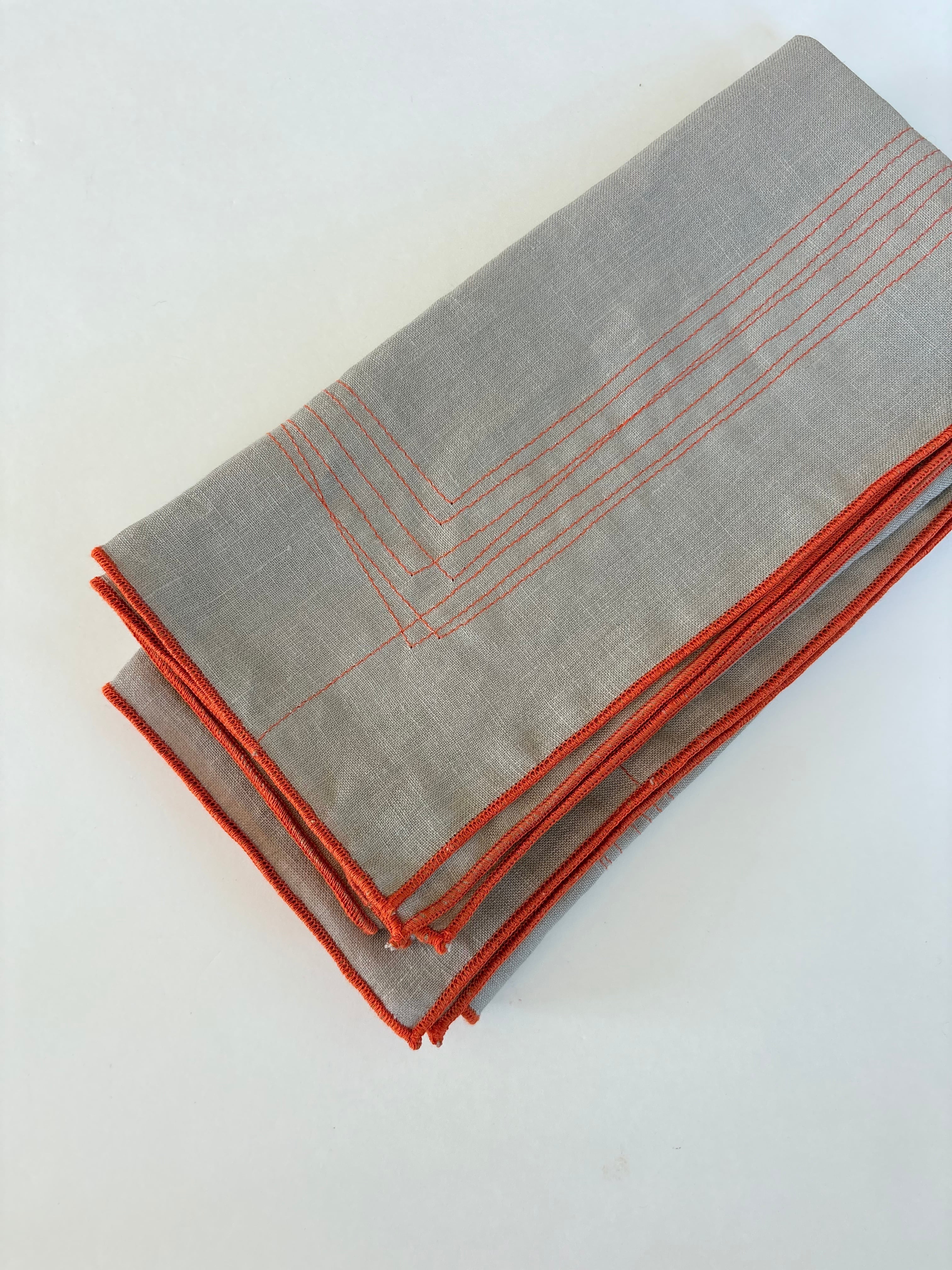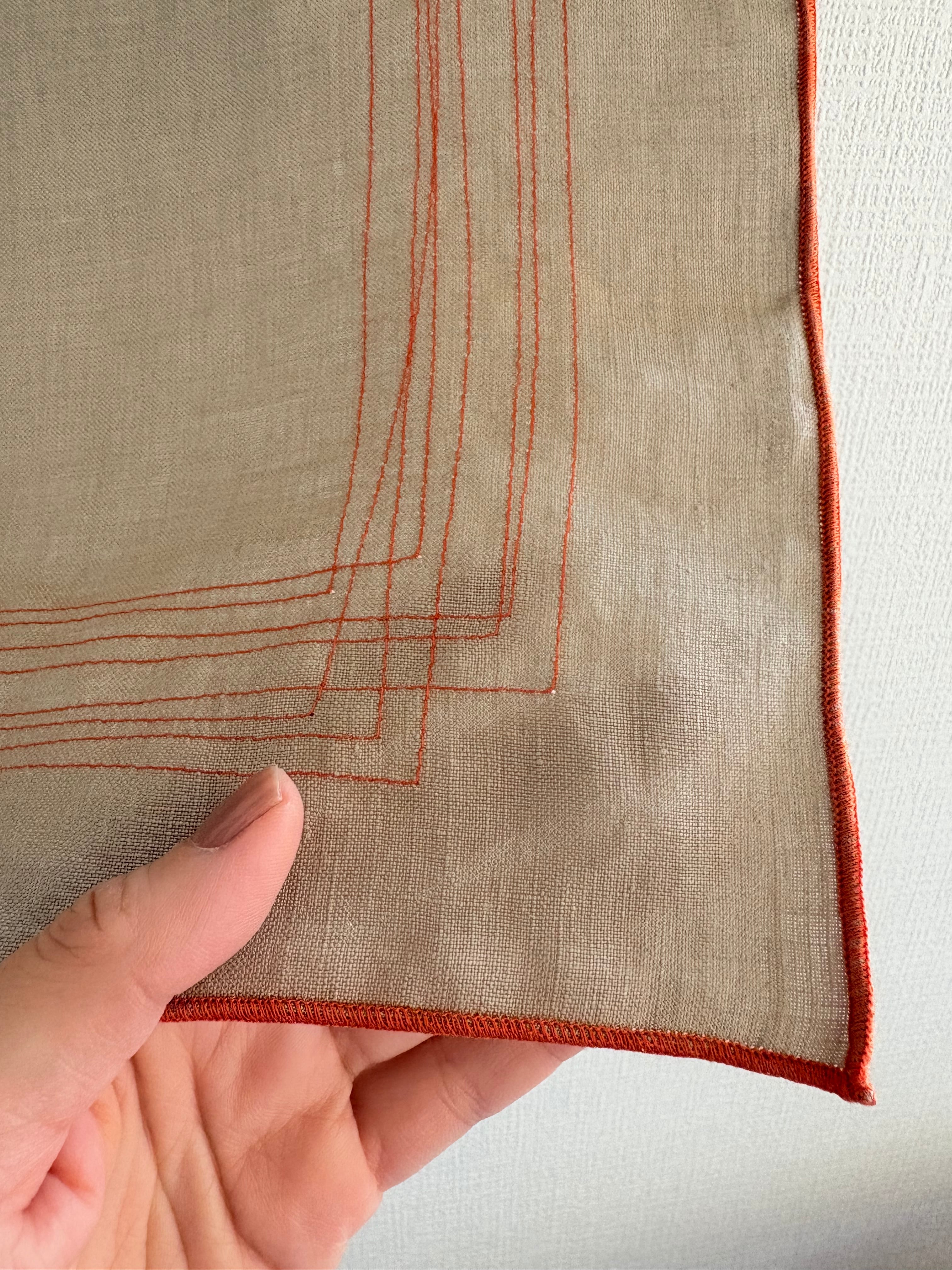 ベージュのリネンにオレンジの色でオリジナルのミシンの模様ステッチを入れ、周りは巻きロックで仕上げています。