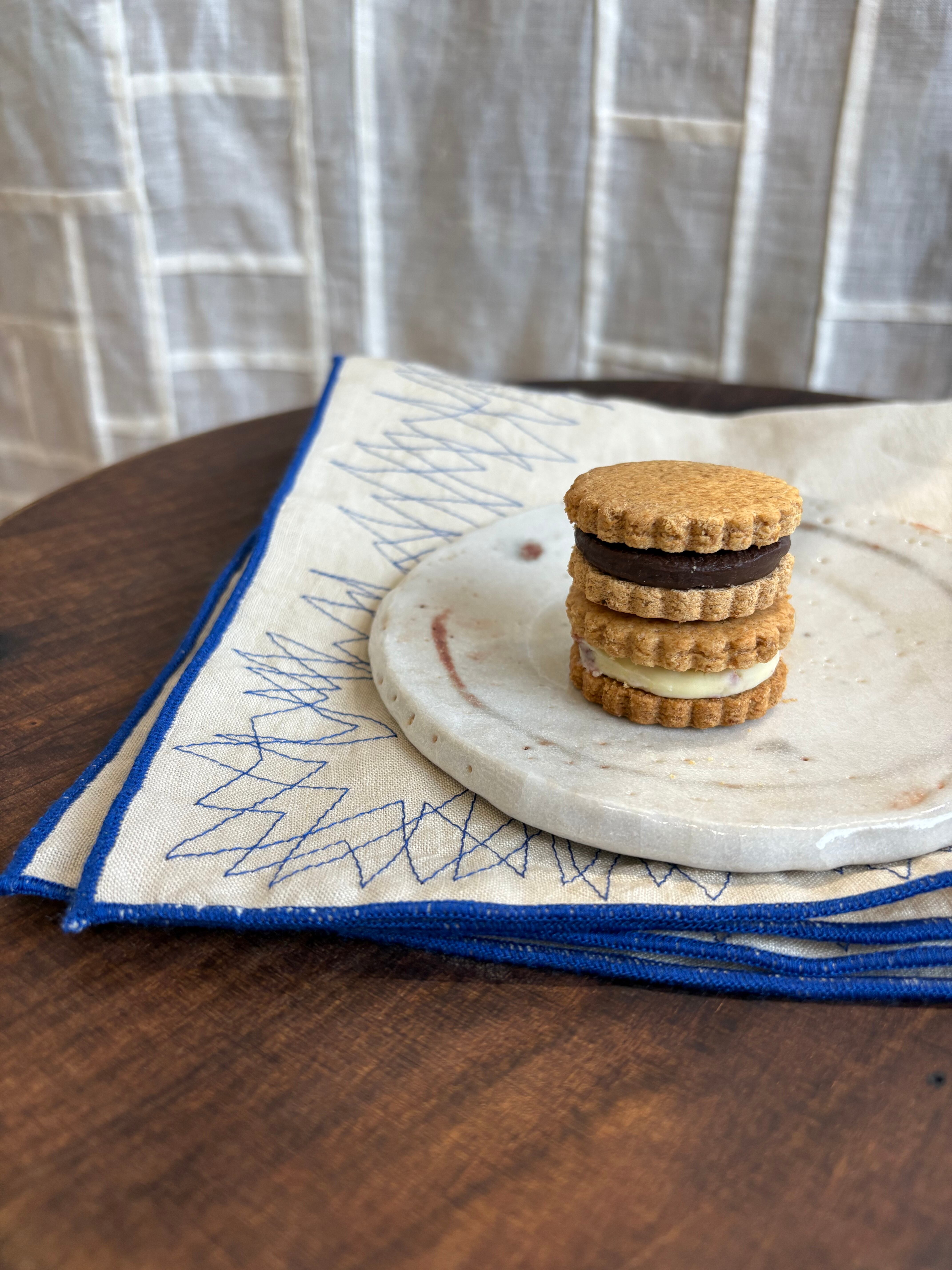 うすベージュのリネンにブルーの色でオリジナルのミシンの模様ステッチを入れ、周りは巻きロックで仕上げています。