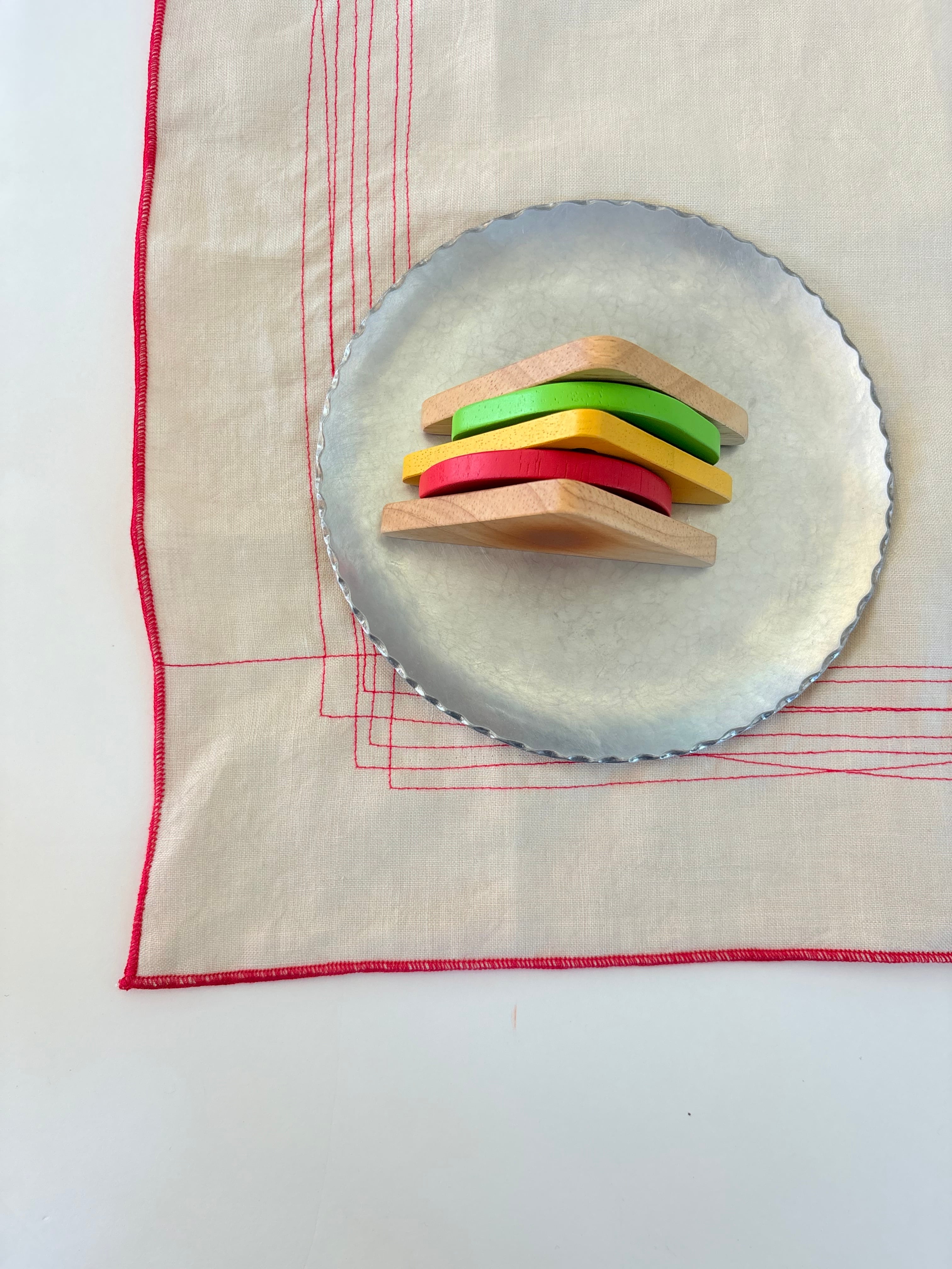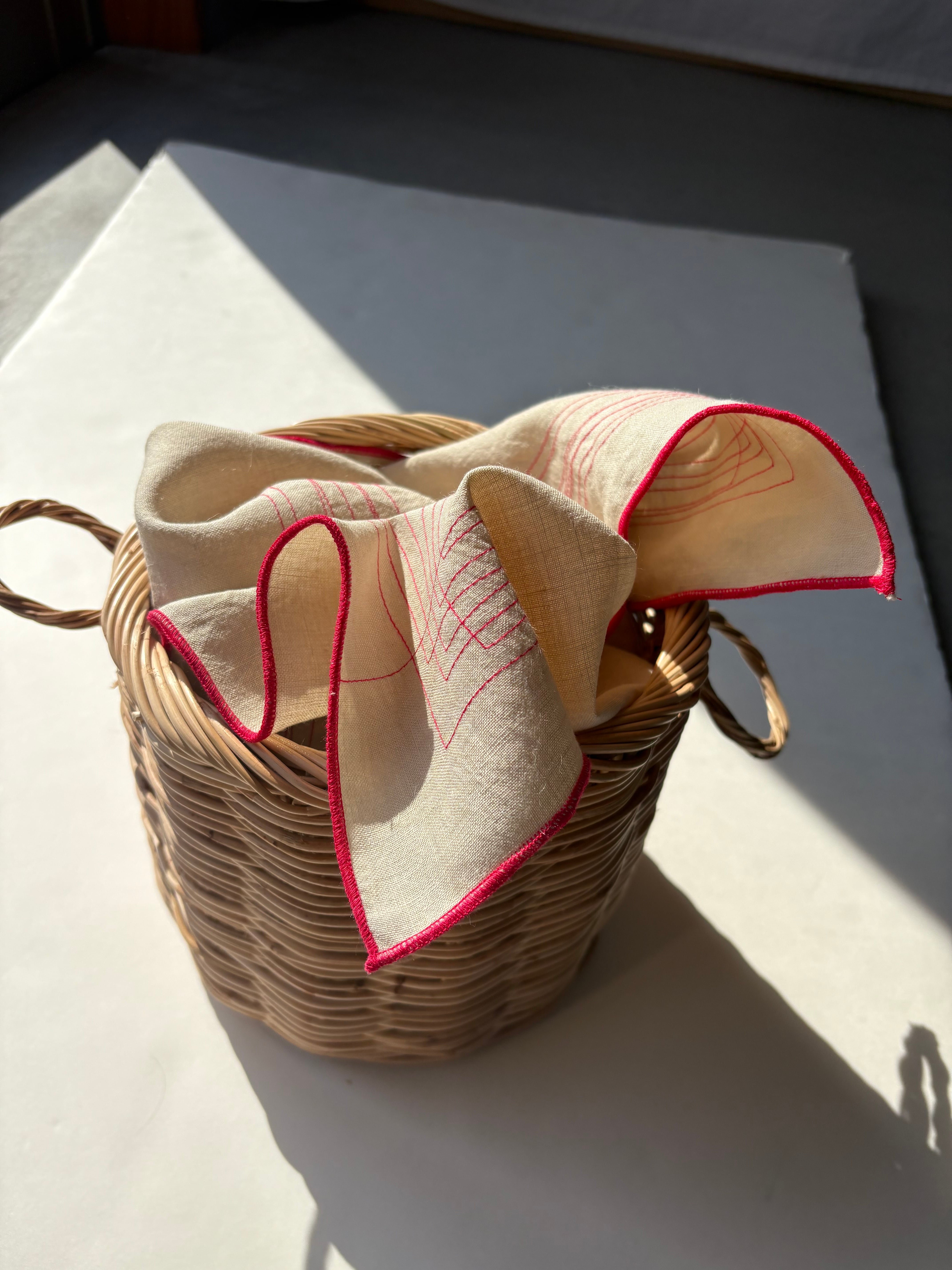 うすベージュのリネンにピンクの色でオリジナルのミシンの模様ステッチを入れ、周りは巻きロックで仕上げています。