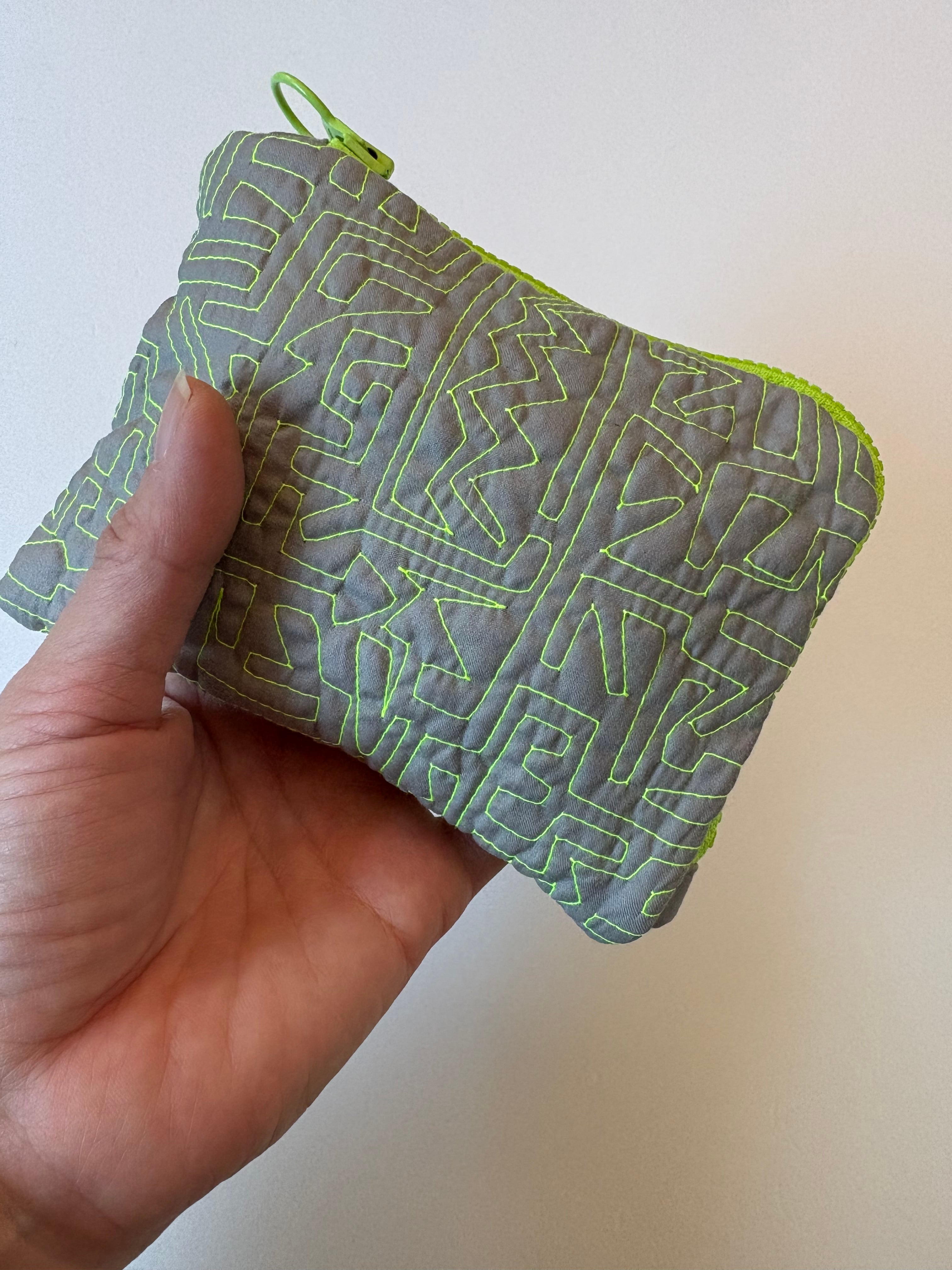 グレーの生地にネオンイエローの糸でステッチを施しています。