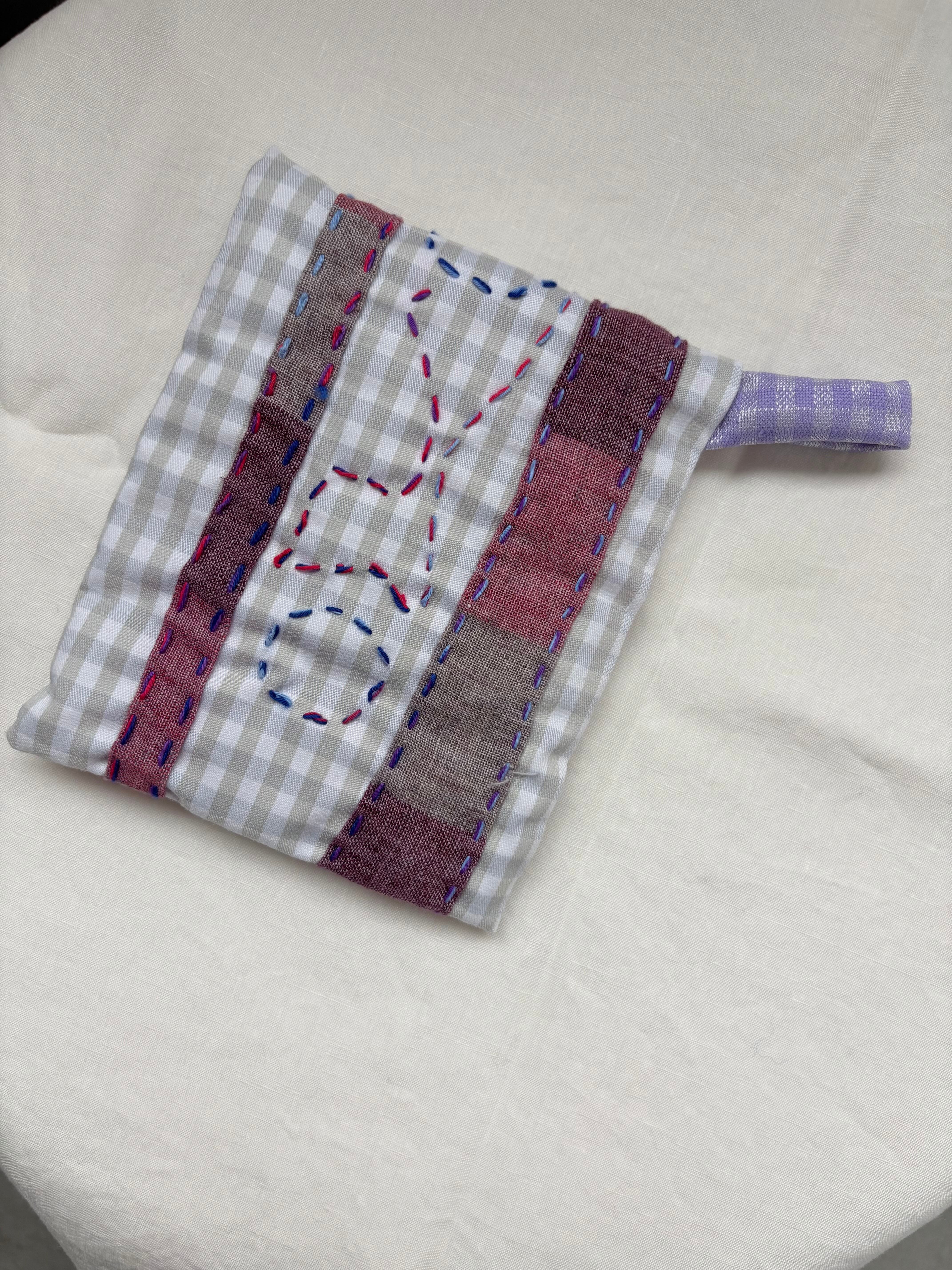個性的な端切れを組み合わせ、ステッチを施した遊び心満載の鍋つかみ兼鍋敷きです。