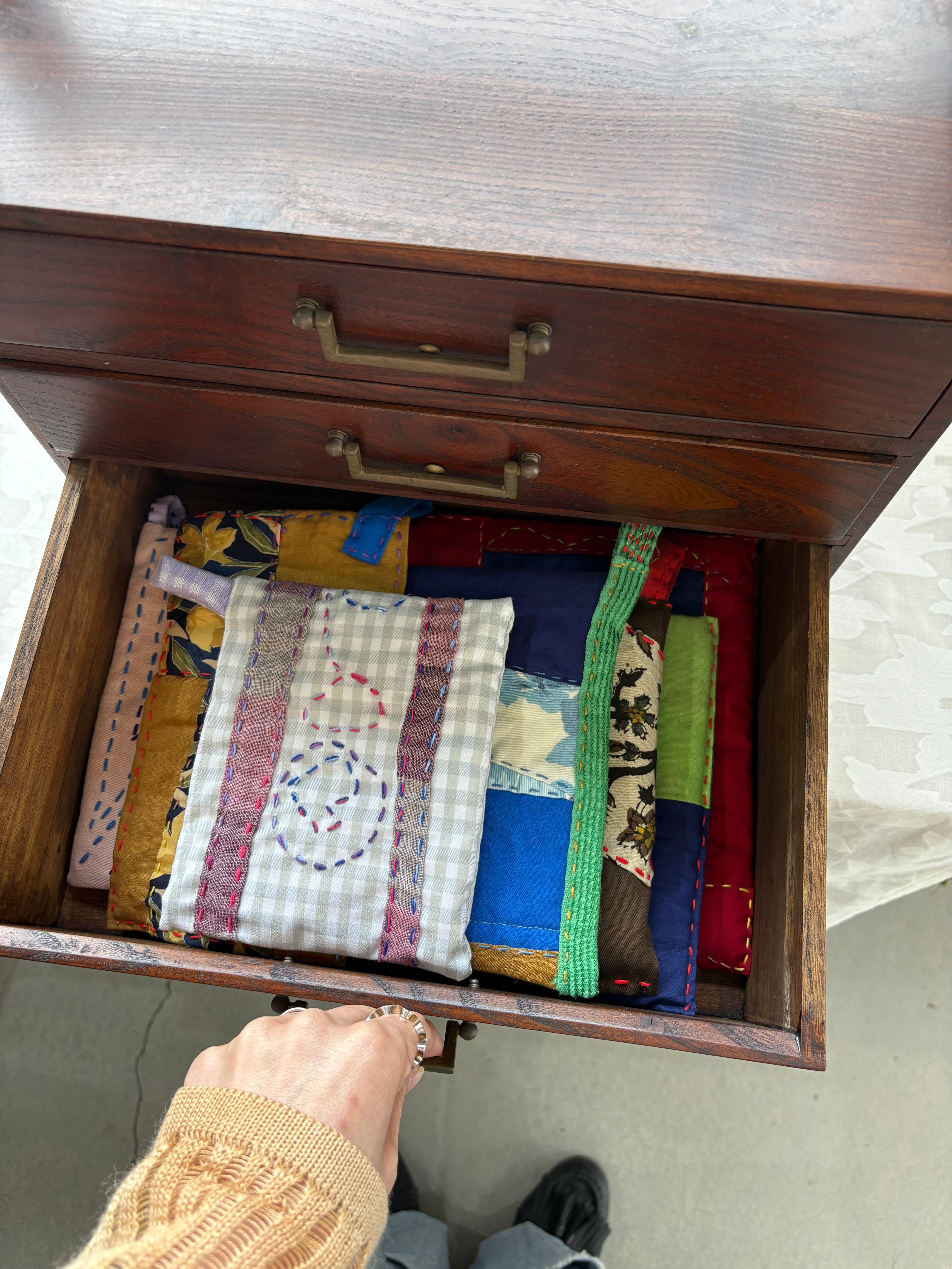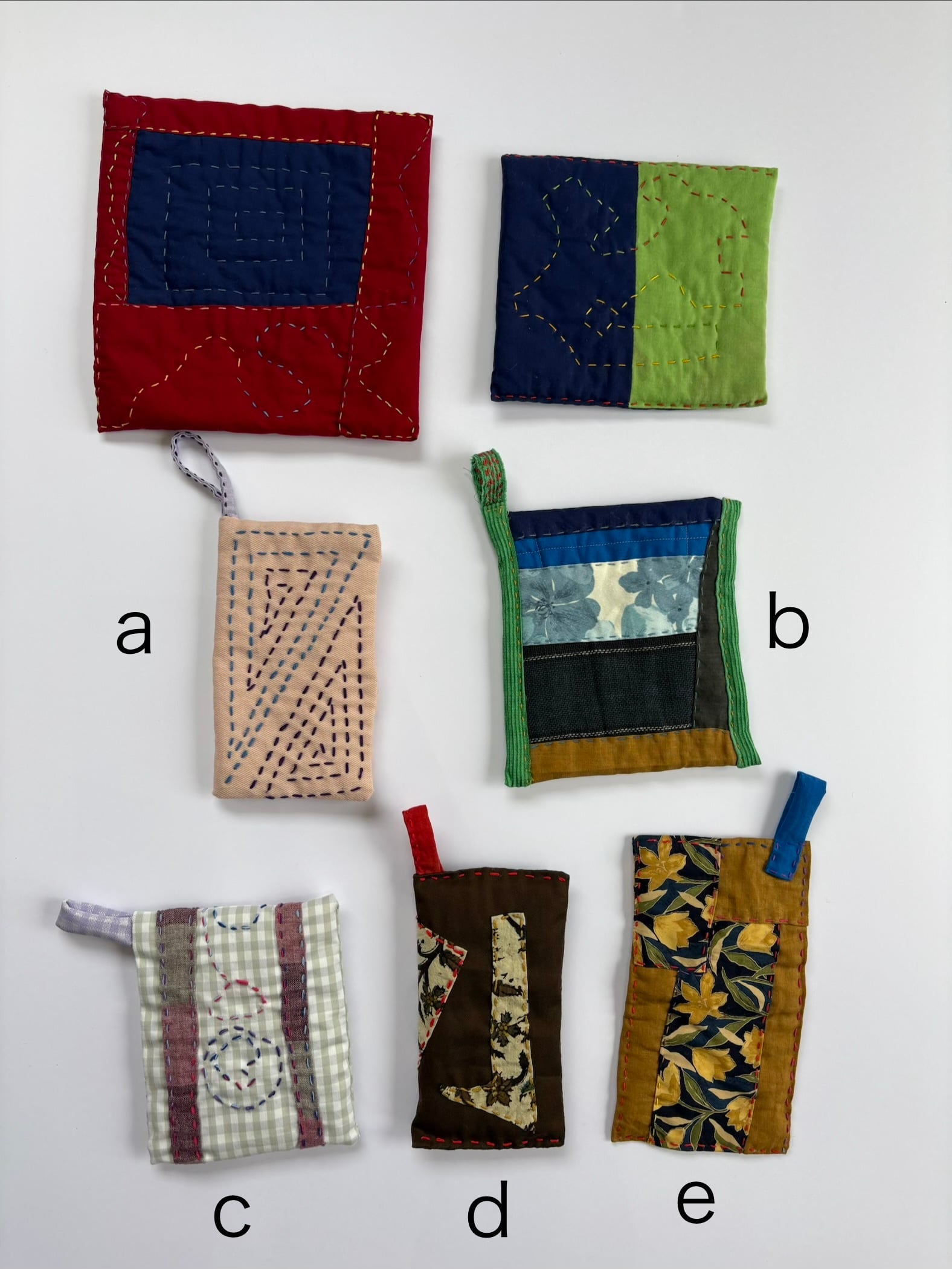 ひとつひとつ手作りのため、サイズや厚み、ステッチのパターン、そして端切れの組み合わせはそれぞれ異なります。