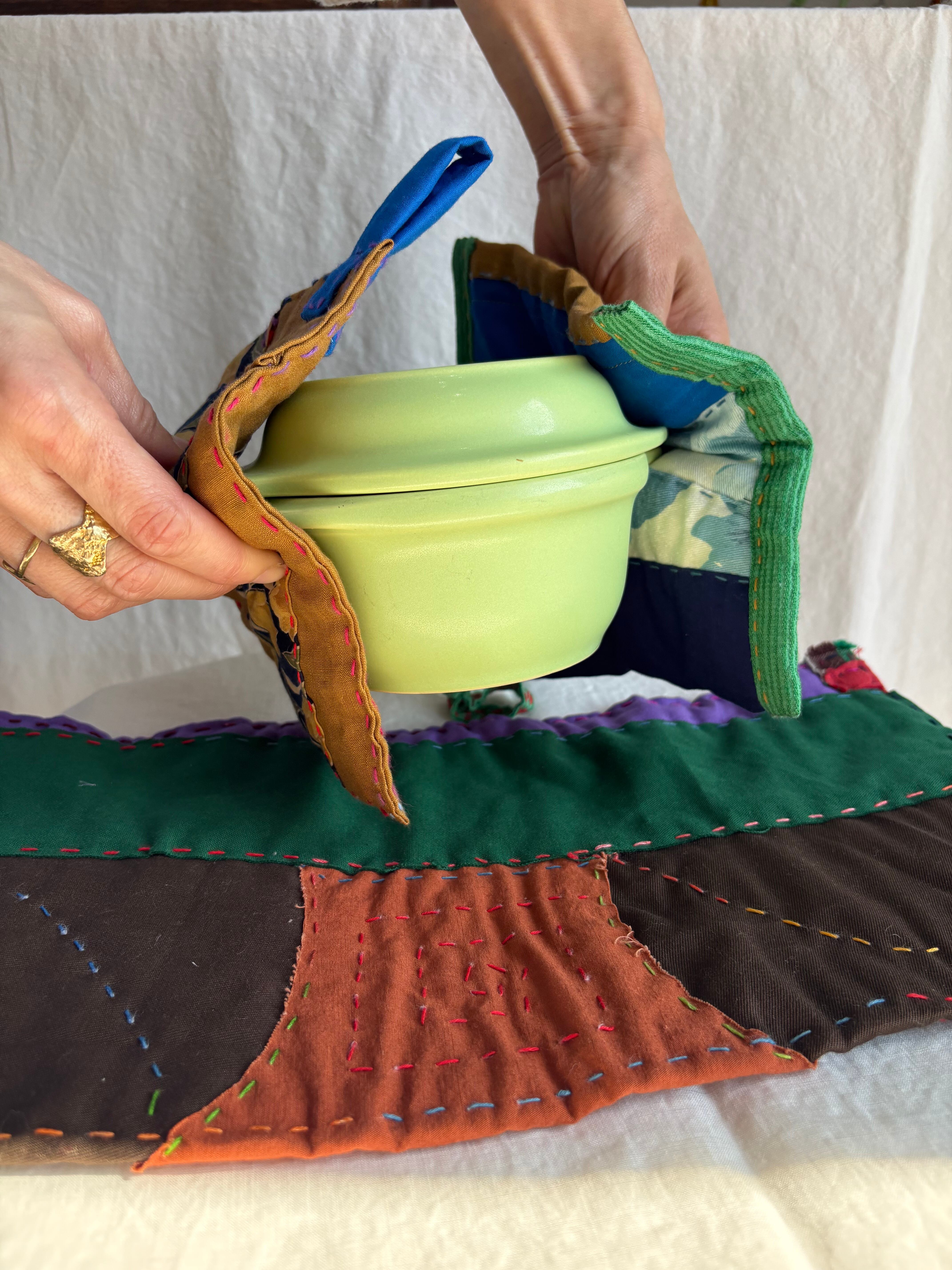 個性的な端切れを組み合わせ、ステッチを施した遊び心満載の鍋つかみ兼鍋敷きです。