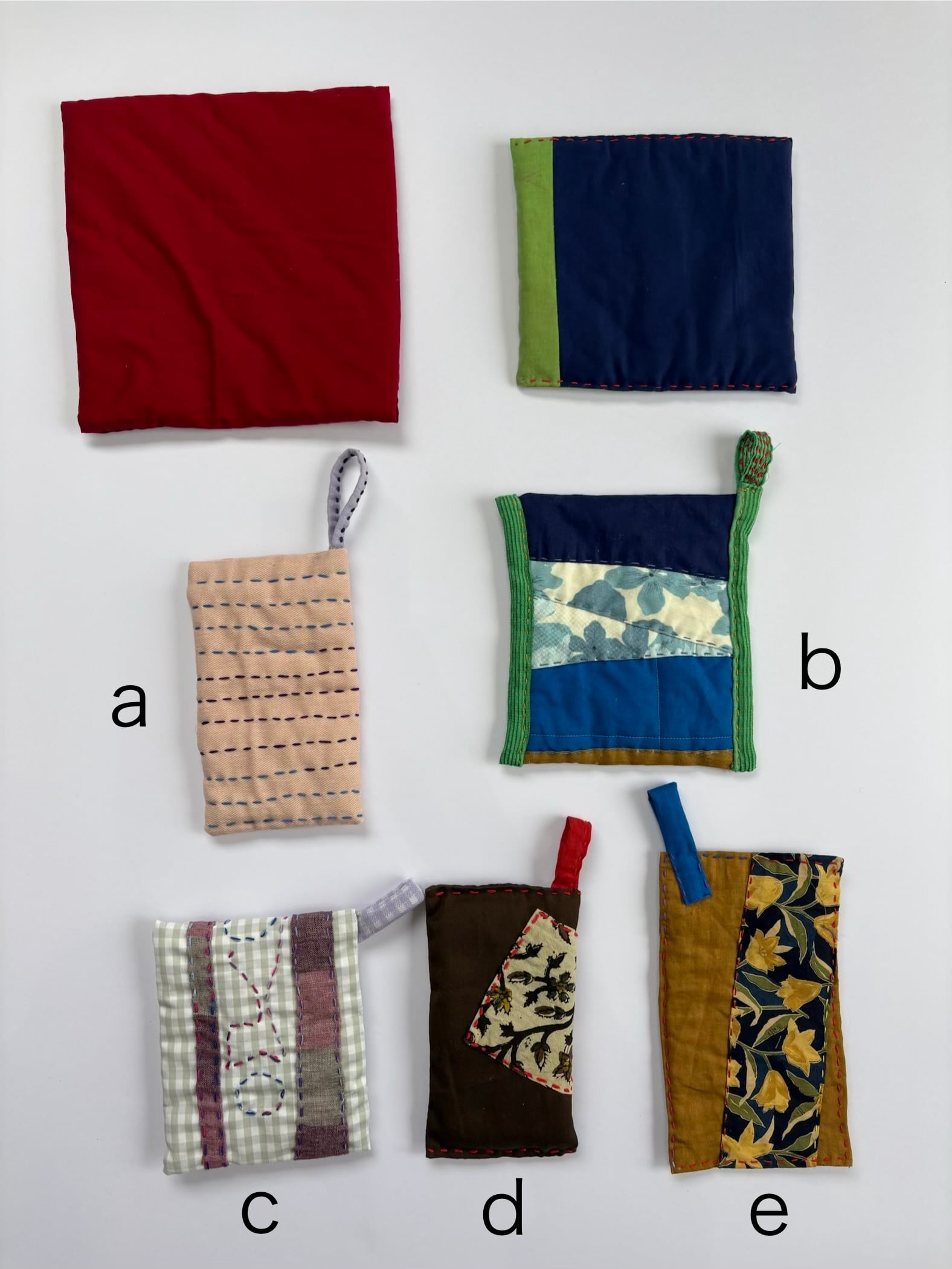 ひとつひとつ手作りのため、サイズや厚み、ステッチのパターン、そして端切れの組み合わせはそれぞれ異なります。