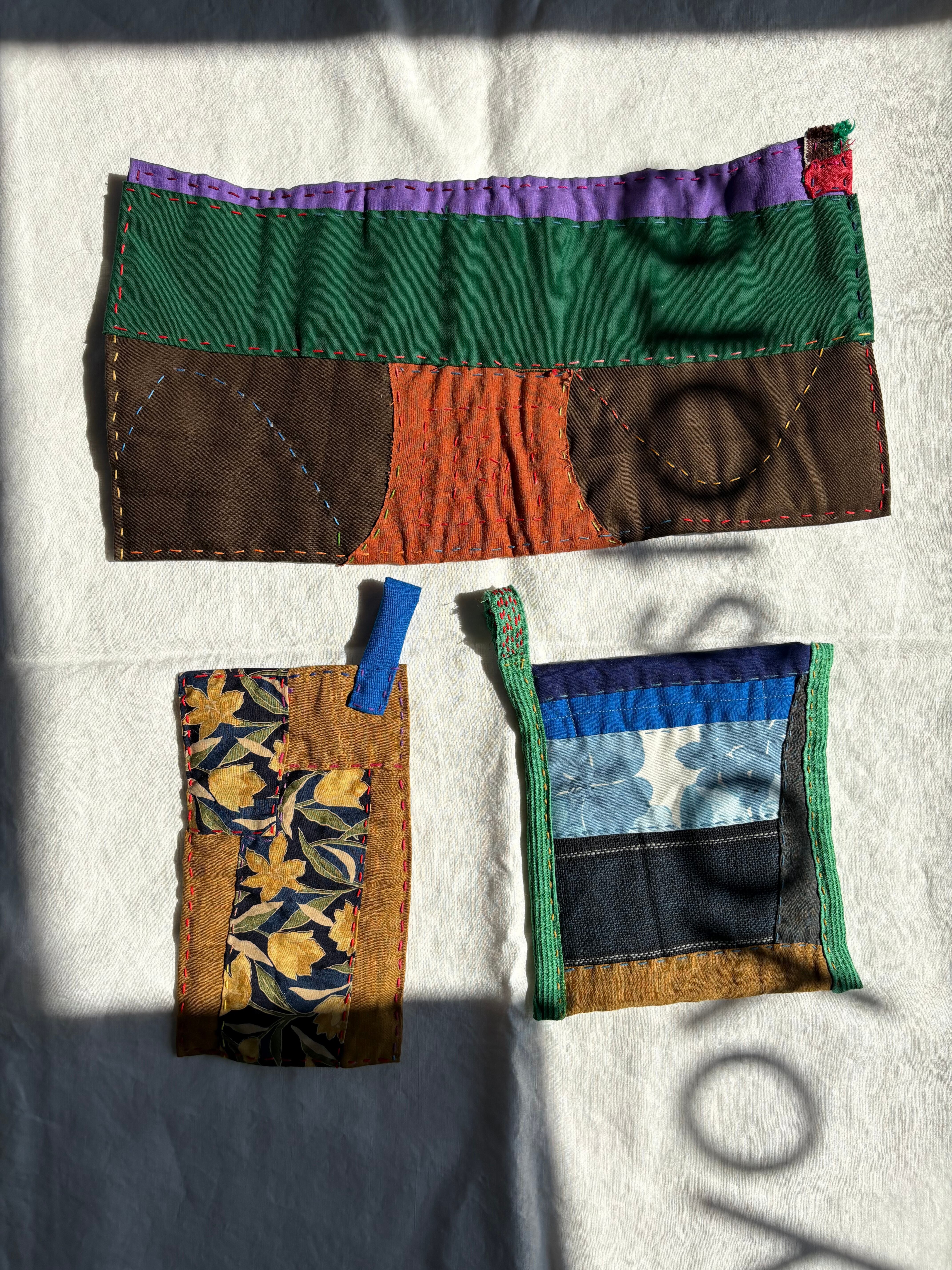 ひとつひとつ手作りのため、サイズや厚み、ステッチのパターン、そして端切れの組み合わせはそれぞれ異なります。