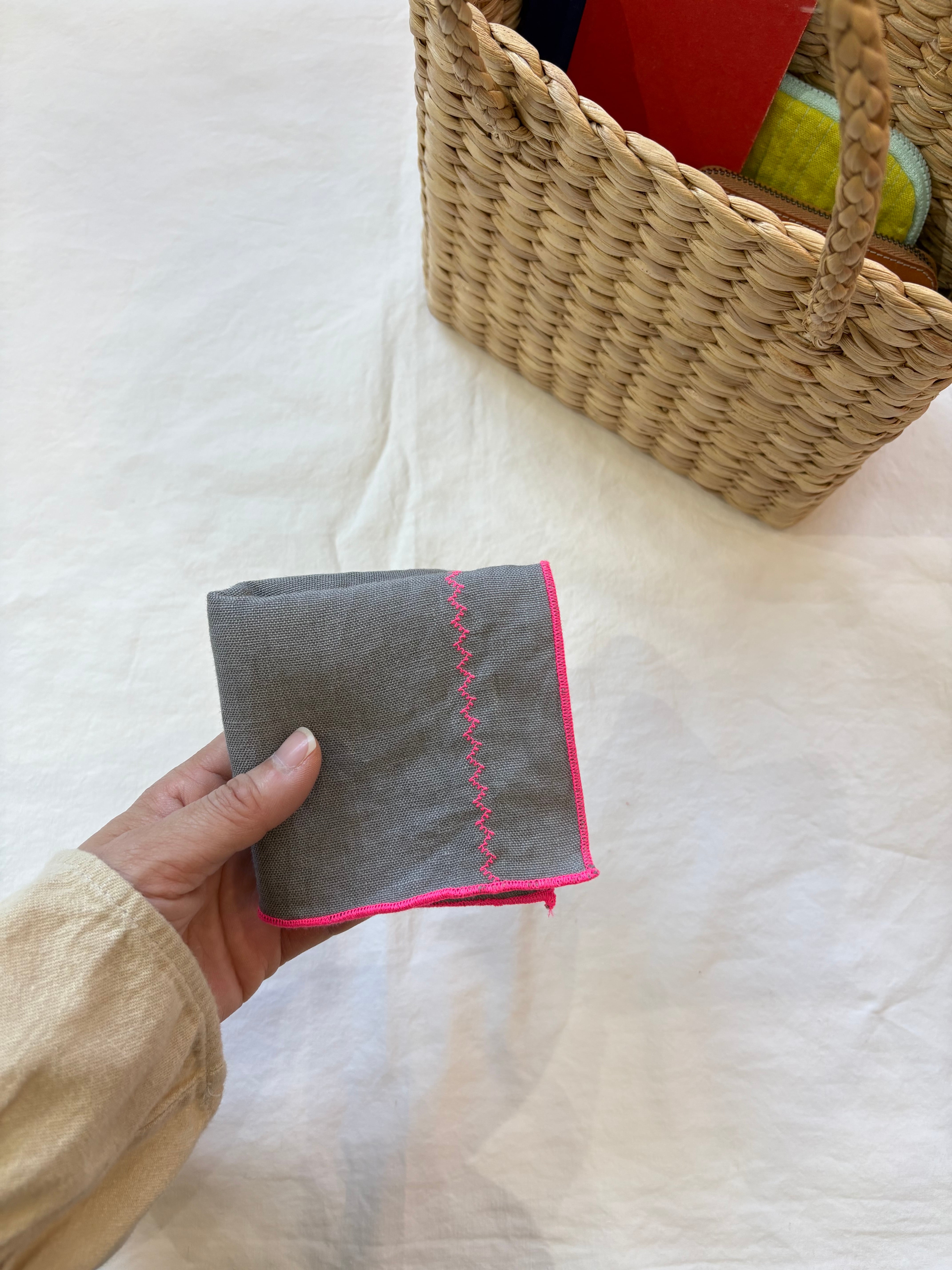 ピンクの刺繍ステッチが施された可愛らしいリネンハンカチ。